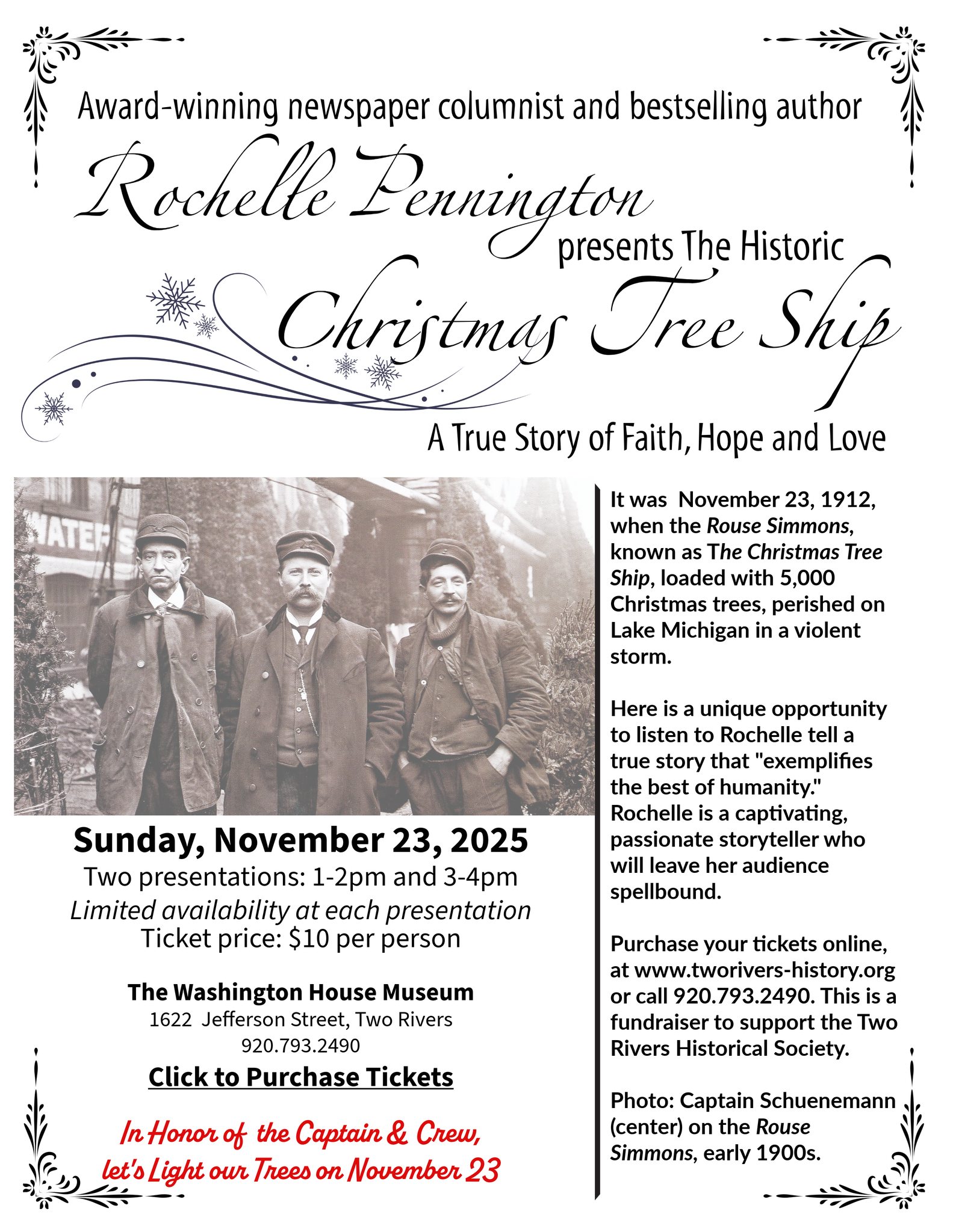 Hear a captivating storyteller recount the tale of the Rouse Simmons, lost to a November gale in 1912 with her crew and cargo of 5,000 Christmas trees.