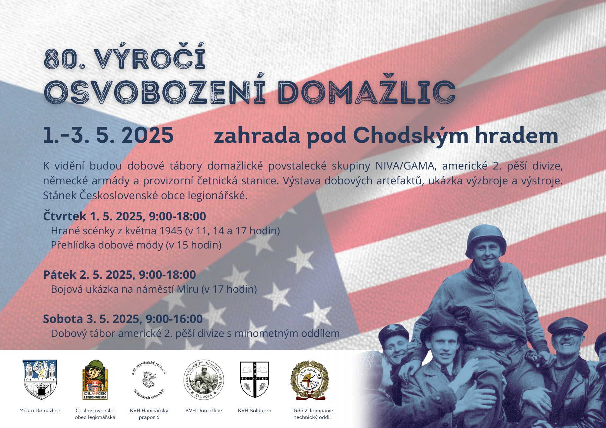 Liberation Day schedule in Czech featuring photo of Lt. Col. Konop held aloft upon the shoulders of townspeople.