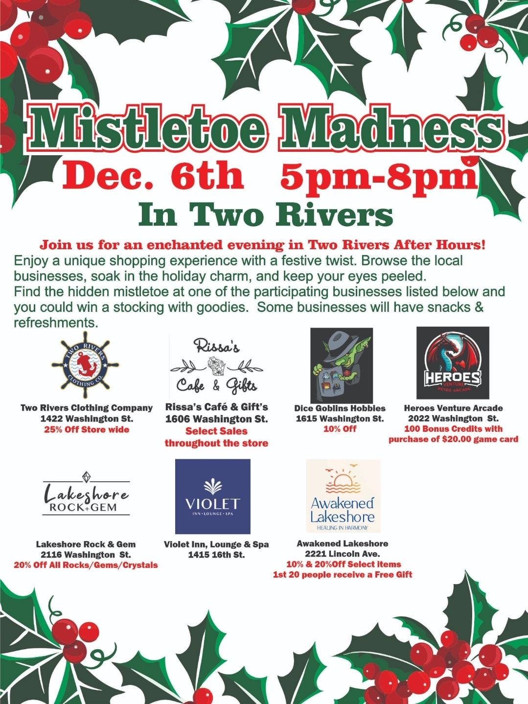 Participating businesses: Two Rivers Clothing Company; Rissa's Cafe & Gifts; Dice Goblin Hobbies; Heroes Venture Arcade; Lakeshore Rock & Gem; Violet Inn, Lounge & Spa; and Awakened Lakeshore.