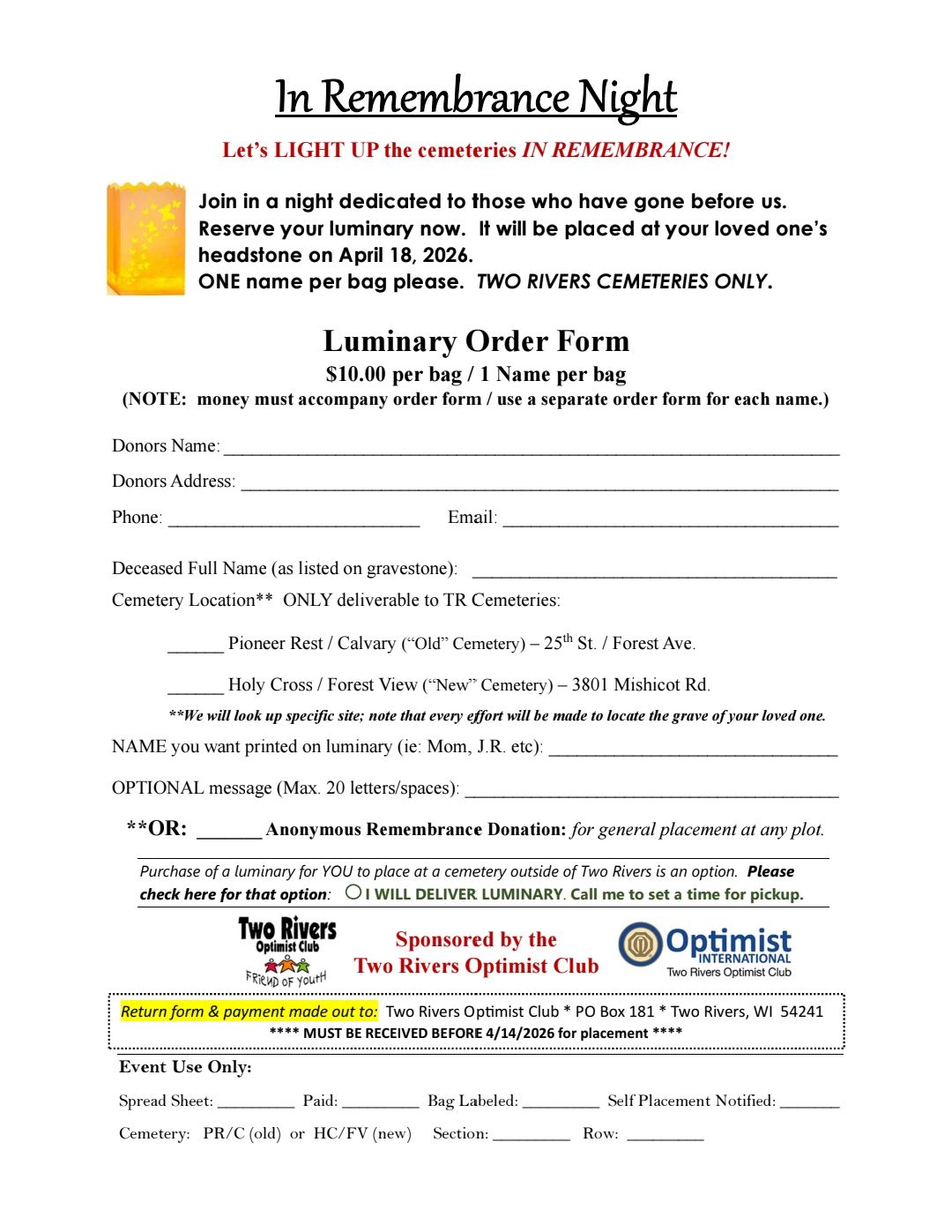 A Two Rivers Optimist Club event. Reserve luminaries in advance and have them placed at loved ones' headstones April 18.